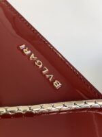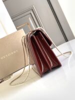 Новая модель из лакрично-гранатовой глубокой бордовой глянцевой матовой кожи теленка. Чувственные глаза из черного оникса бордового цвета с золотыми эмалевыми акцентами. Классическая магнитная застежка в виде головы змеи – гламурный штрих. Два отделения, один передний карман, один задний карман с нашивкой, один внутренний карман на молнии и открытый карман, персонализированное зеркало и металлический логотип BVLGARI на задней стороне. Несколько отделений. Увеличенная вместимость. Цепочка разумной длины. Не слишком большая и не слишком маленькая, как раз то, что нужно. С обновленной подарочной коробкой. Размер: 25*17*8 см.