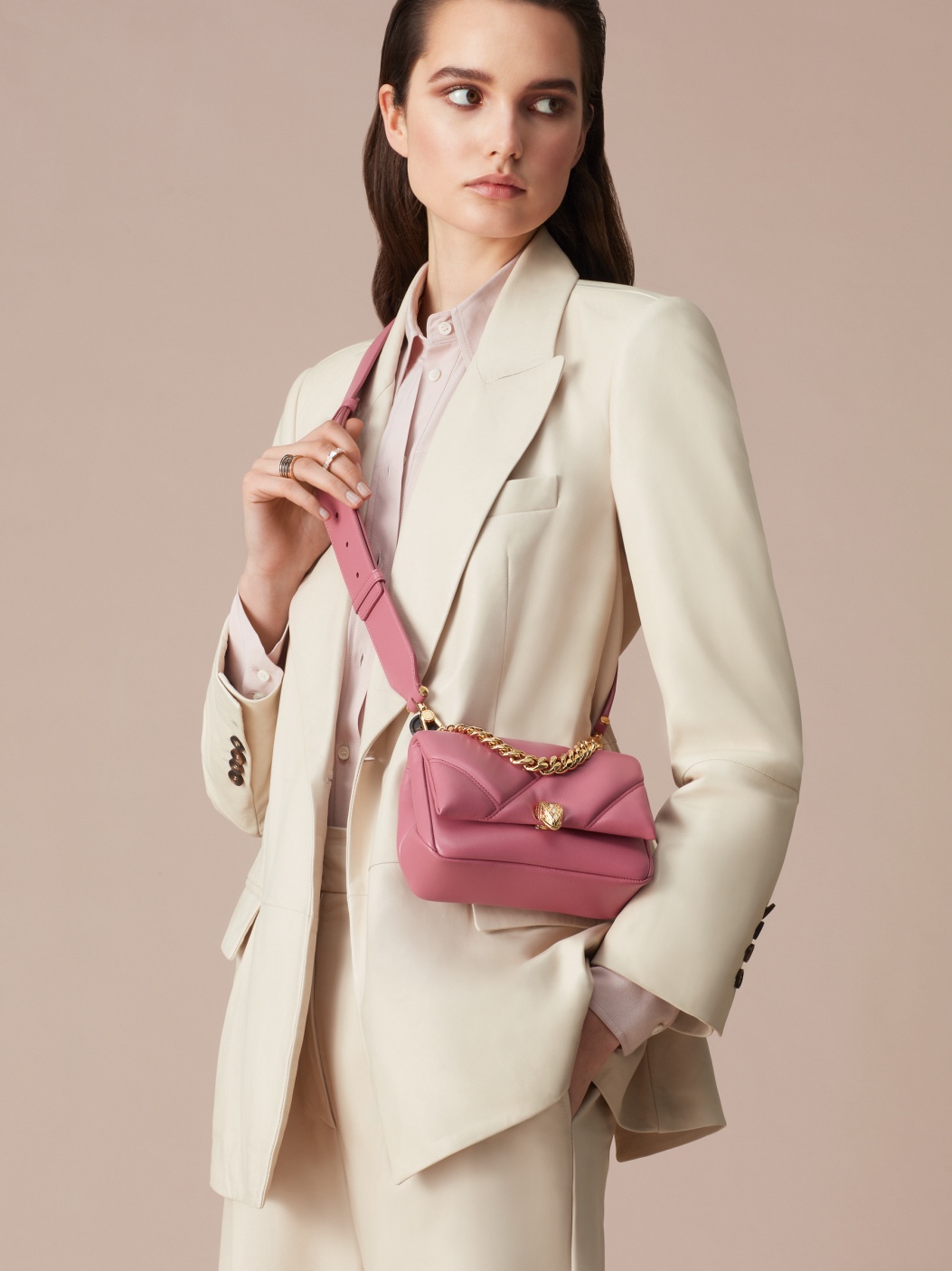 Коллекция SERPENTI CABOCHON. Мини-сумка кроссбоди и смелые металлические детали в изысканном и практичном уникальном дизайне. Крупный выпуклый геометрический узор. Вдохновленный потрясающими поверхностями драгоценных камней огранки “яйцо” придает мягкость и гладкость бледно-кварцево-розовой телячьей коже этой сумки. Позолоченная латунная застежка в виде головы змеи вдохновлена винтажными часами Bvlgari.