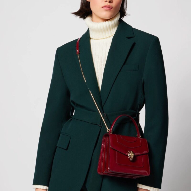 “Serpenti Forever” из лакрично-гранатовой глубокой бордовой глянцевой матовой кожи теленка. Бордовый цвет с золотой эмалью и чувственными глазами из камня черного оникса. Классическая магнитная застежка в виде головы змеи – гламурный штрих. Регулируемая змеиная цепочка и кожаный плечевой ремень. Три отделения для хранения. Внутренний открытый зеркальный карман. Открытый карман. Задний карман с внешней накладной отделкой. Одно компактное зеркало. Легко сочетать со стильной повседневной одеждой. Поставляется в обновленной подарочной коробке. Размер: 18*15*9,5 см.