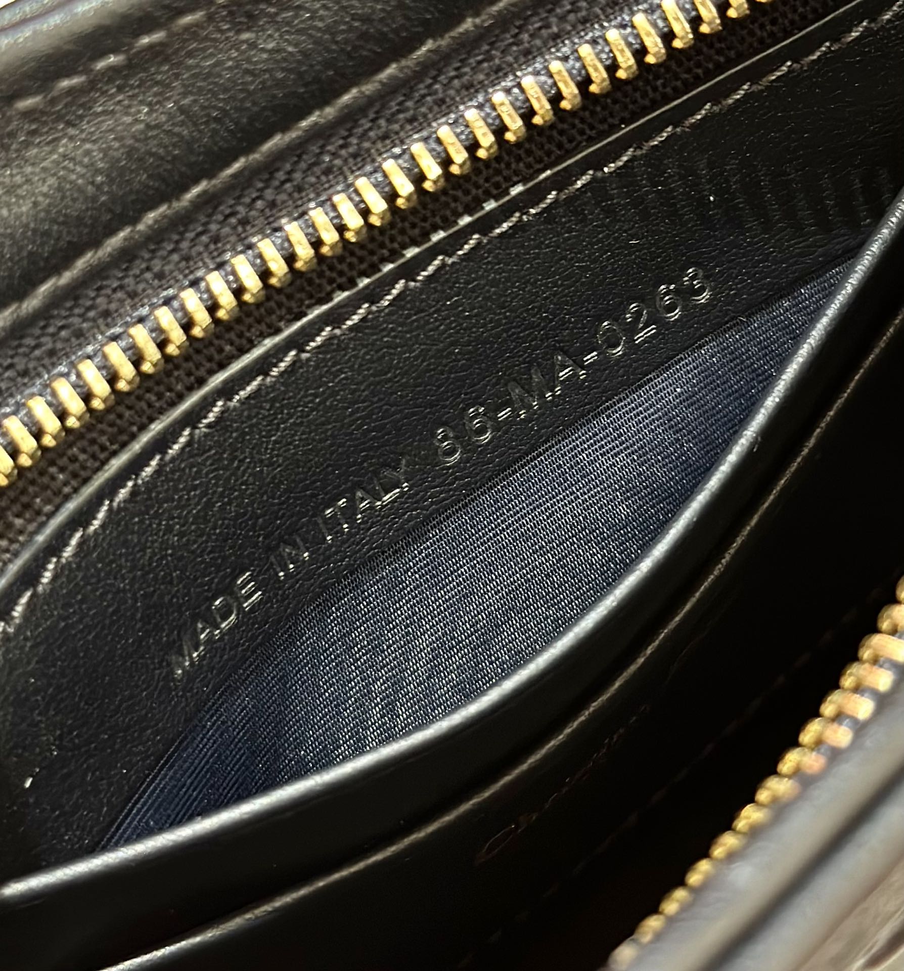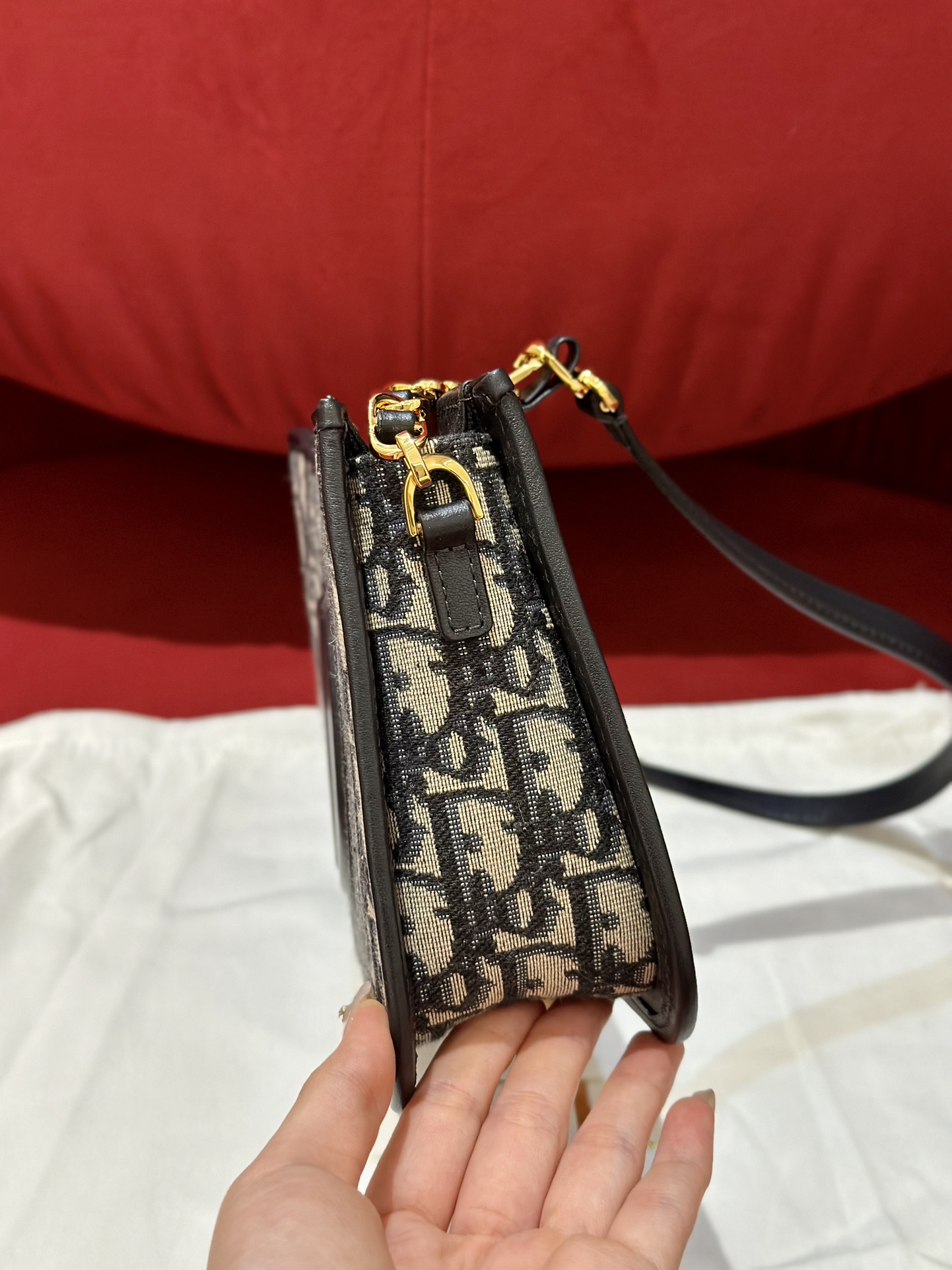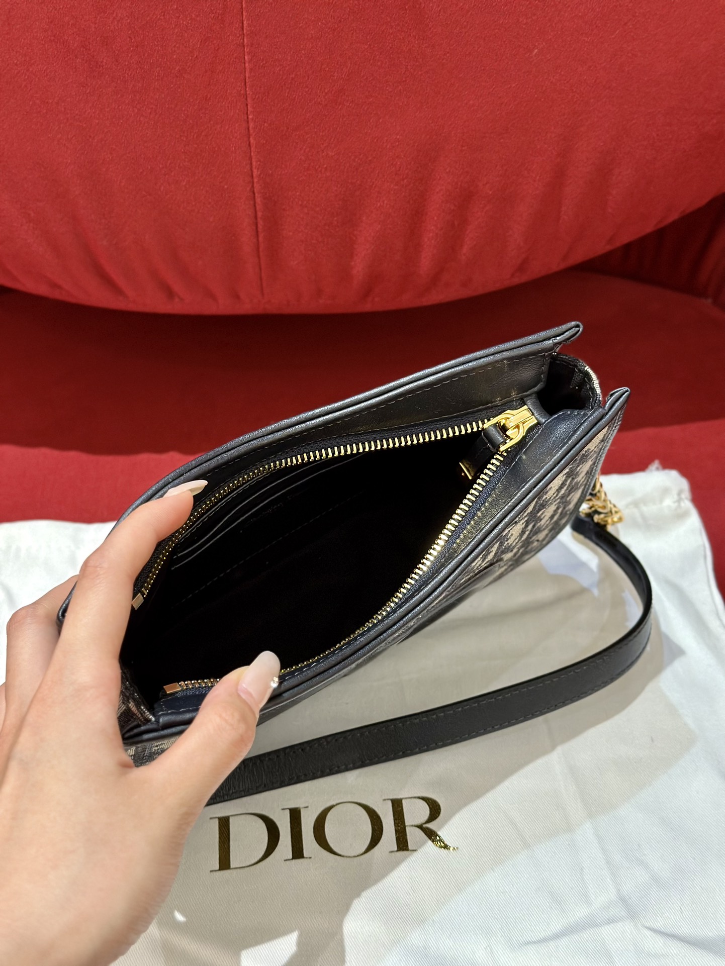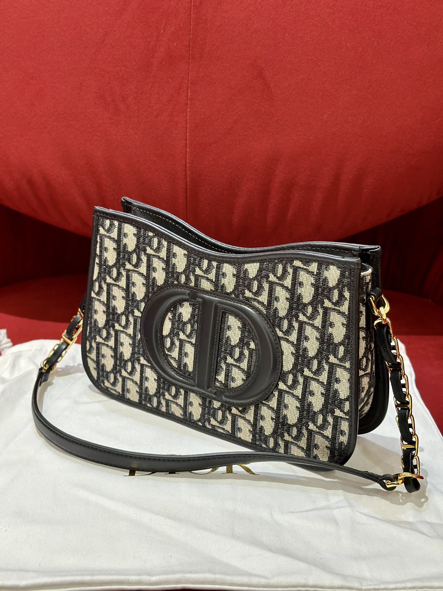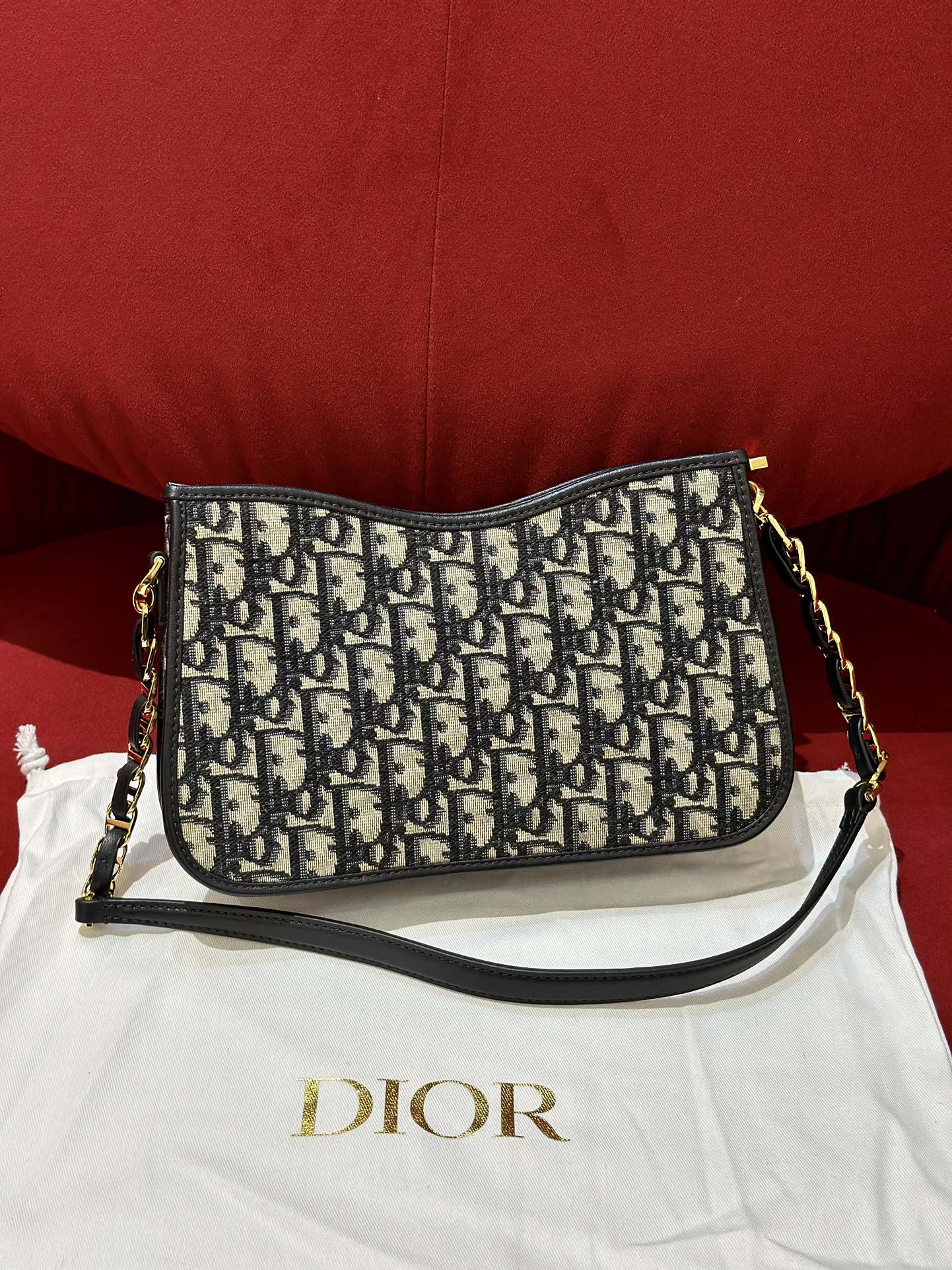 Серия Montaigne Hobo, тщательно выполненная из синей ткани Oblique для пресбиопии, с кожаными лямками и цепочками на плечах, из звеньев цепочки золотистого цвета. Размер: 23*5*15 см.