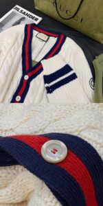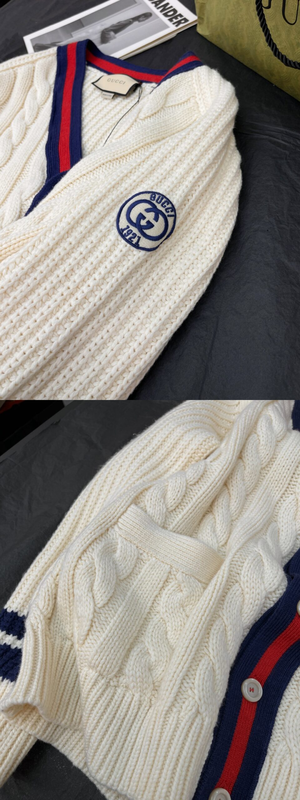 Новый шерстяной кардиган. Шерстяная ткань на заказ. Вышитый перламутровый логотип-медальон 1921 на левой стороне. Уникальный V-образный вырез с элементами колорблокинга возвращает классику. Стиль унисекс.