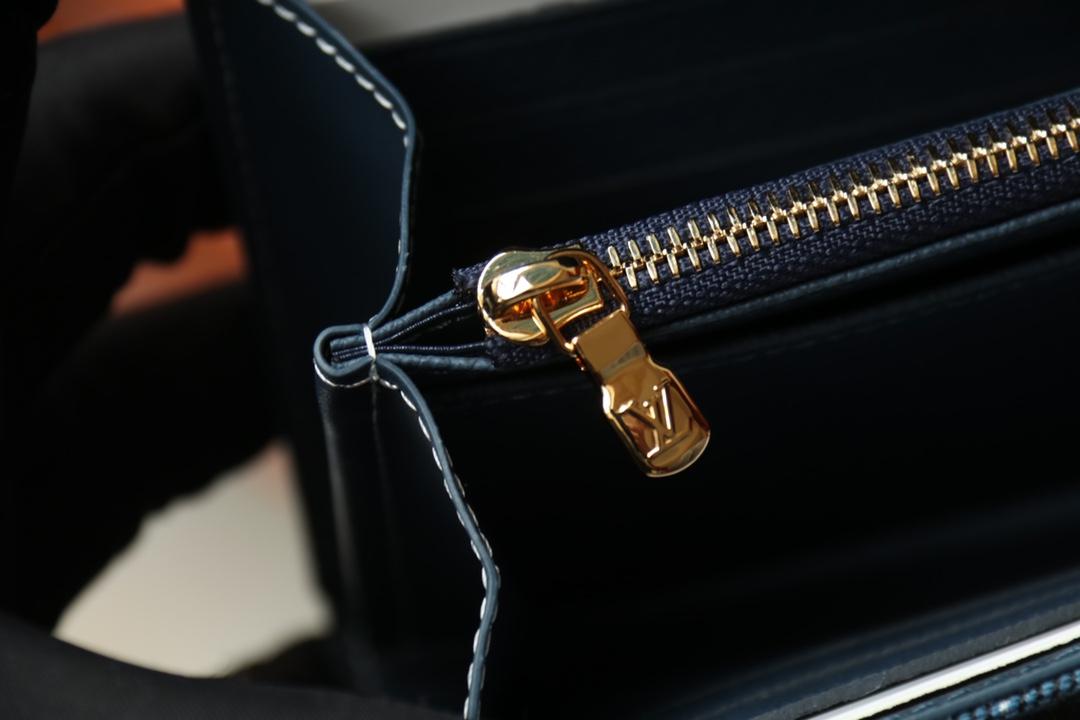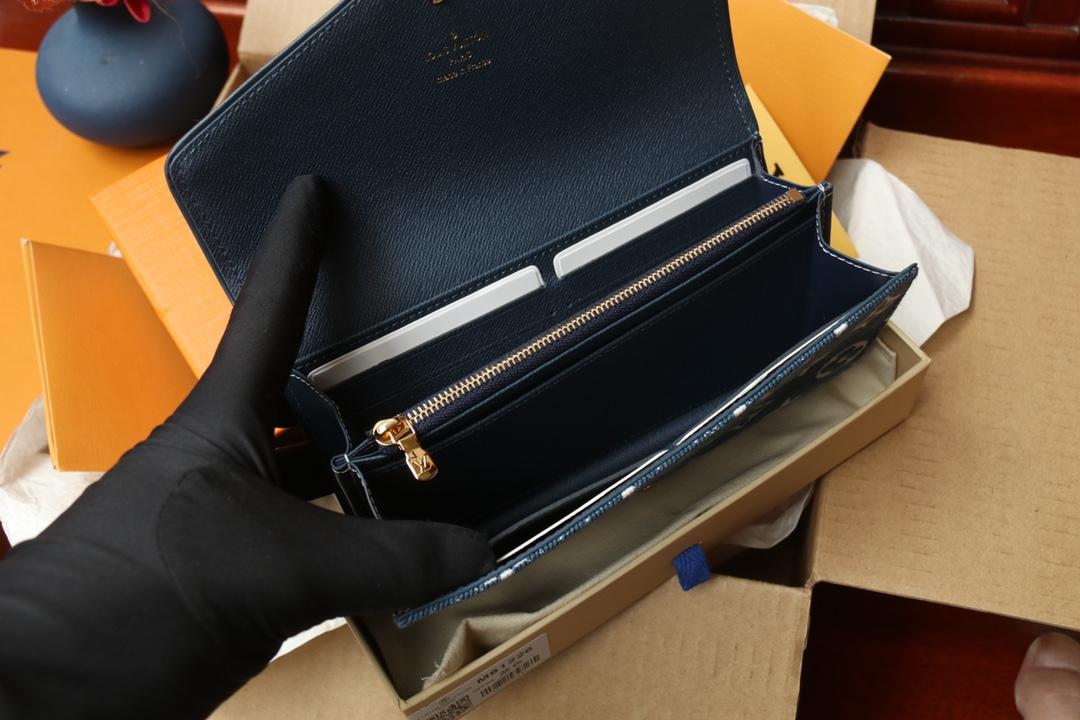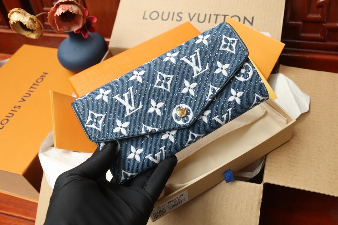 Элегантный кошелек-конверт с застежкой-кнопкой с гравировкой Louis Vuitton, которая открывается, открывая несколько карманов и отделение для кредитной карты.