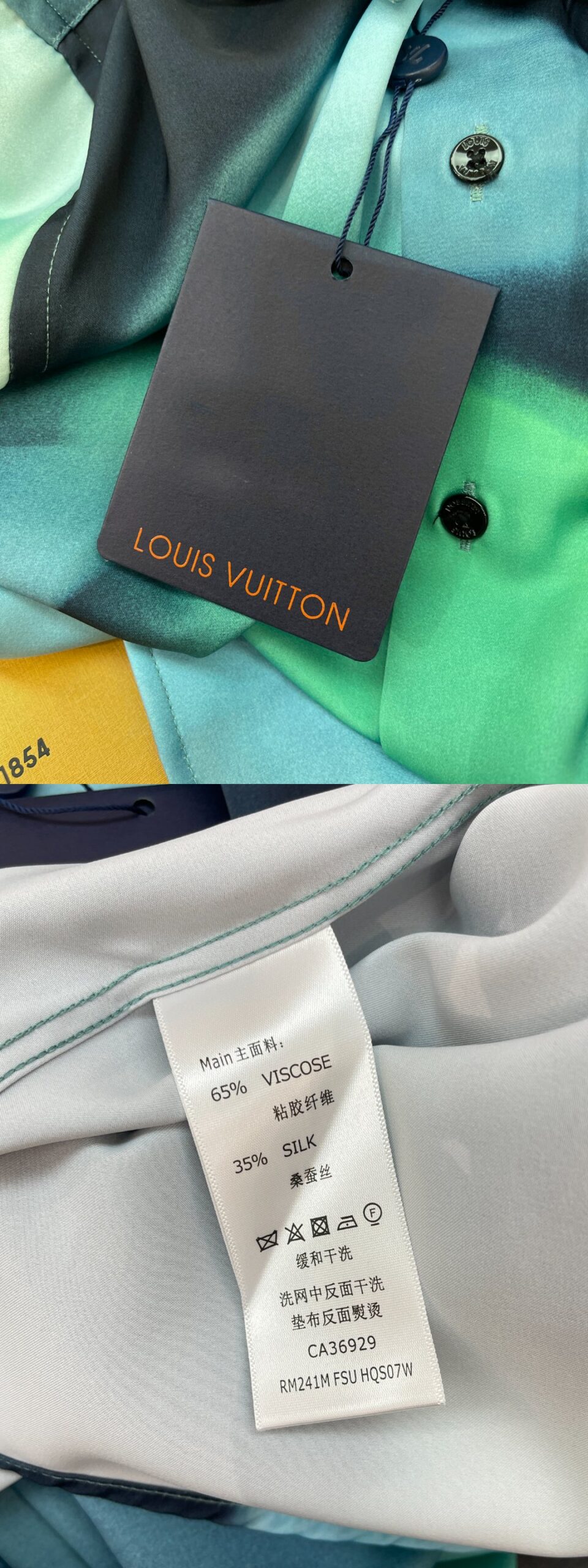 Новая ослепительно-градиентная рубашка. Индивидуальная шелковая ткань 180 г. Удобная и дышащая форма. LV Borealis принты. Вдохновленные градиентом цвета авроры бореалис. Логотип 1V и цветы Monogram незаметно появляются спереди и сзади. Художественные и игривые. Разнообразят скучные наряды.
