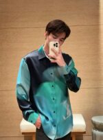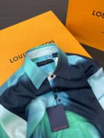 Новая ослепительно-градиентная рубашка. Индивидуальная шелковая ткань 180 г. Удобная и дышащая форма. LV Borealis принты. Вдохновленные градиентом цвета авроры бореалис. Логотип 1V и цветы Monogram незаметно появляются спереди и сзади. Художественные и игривые. Разнообразят скучные наряды.