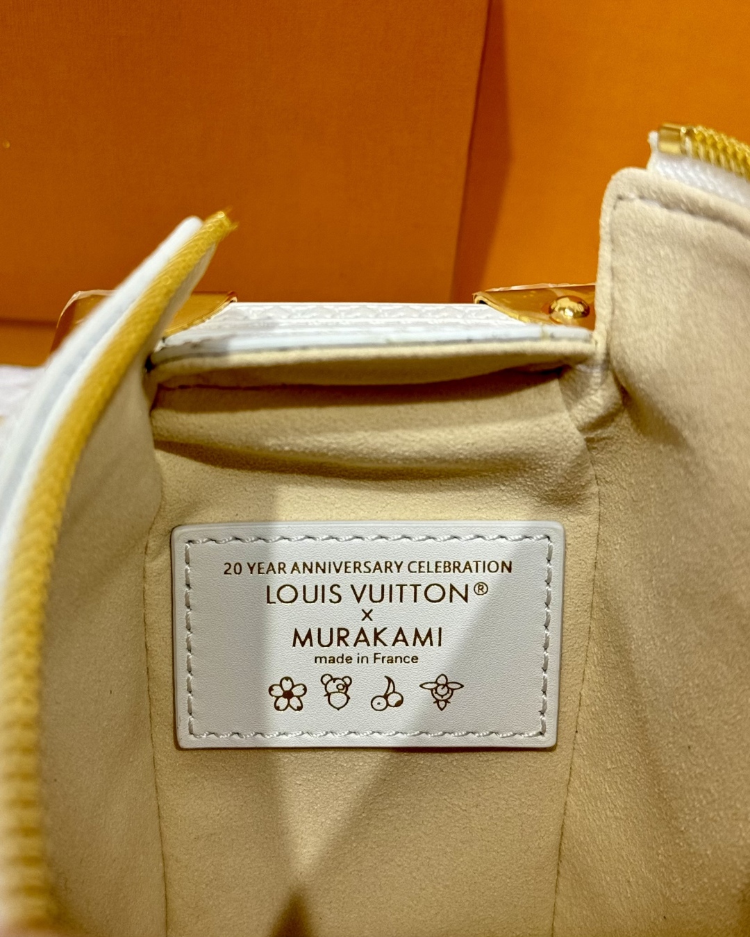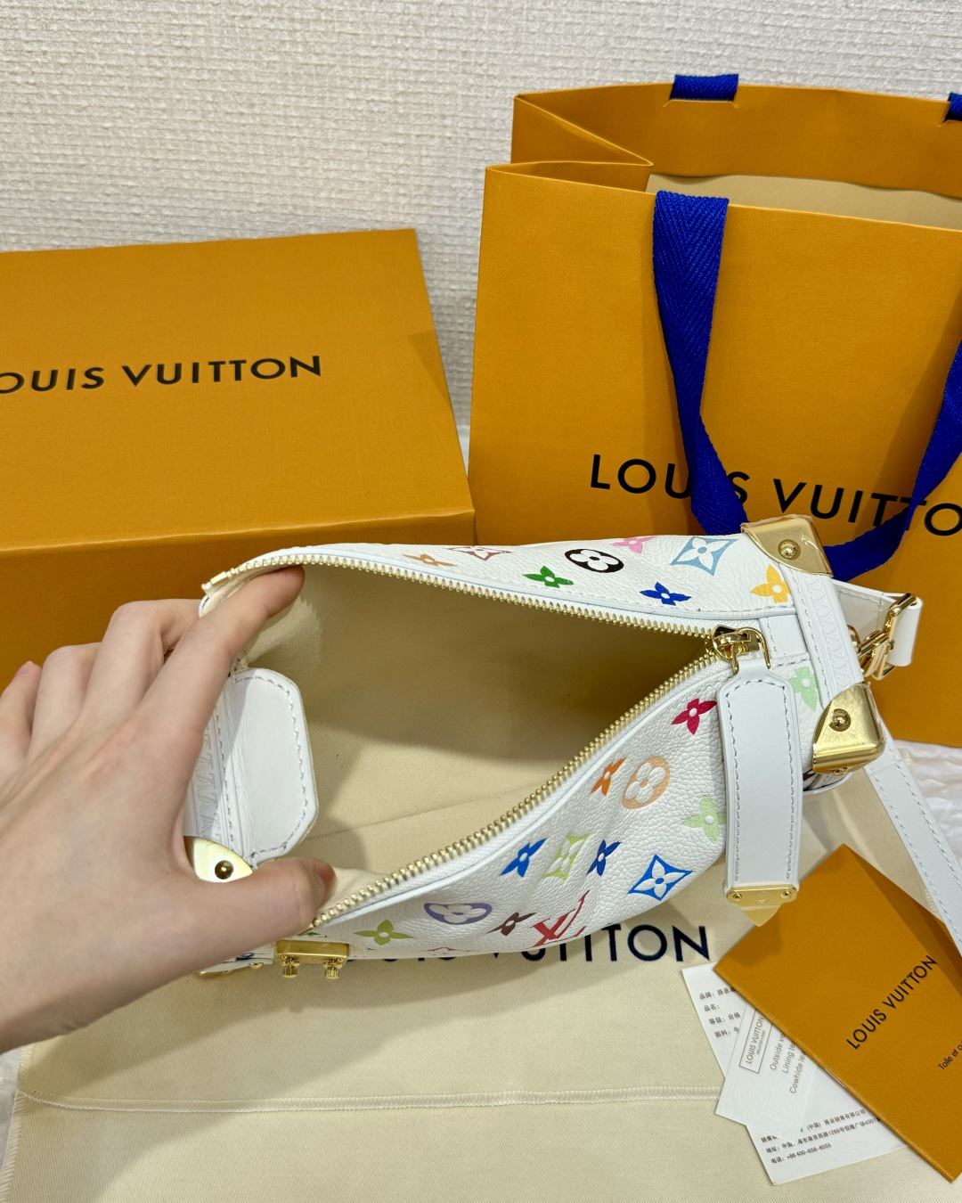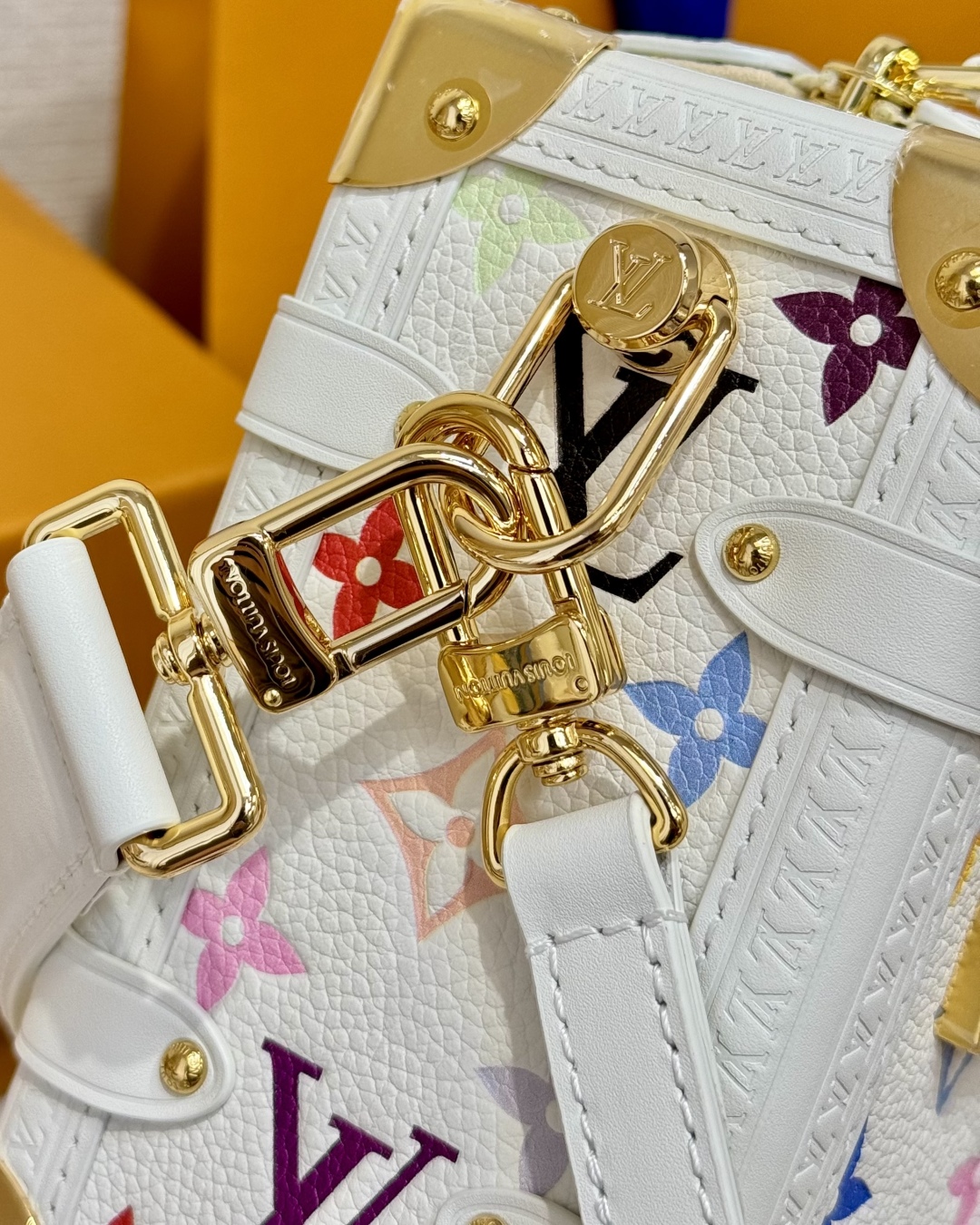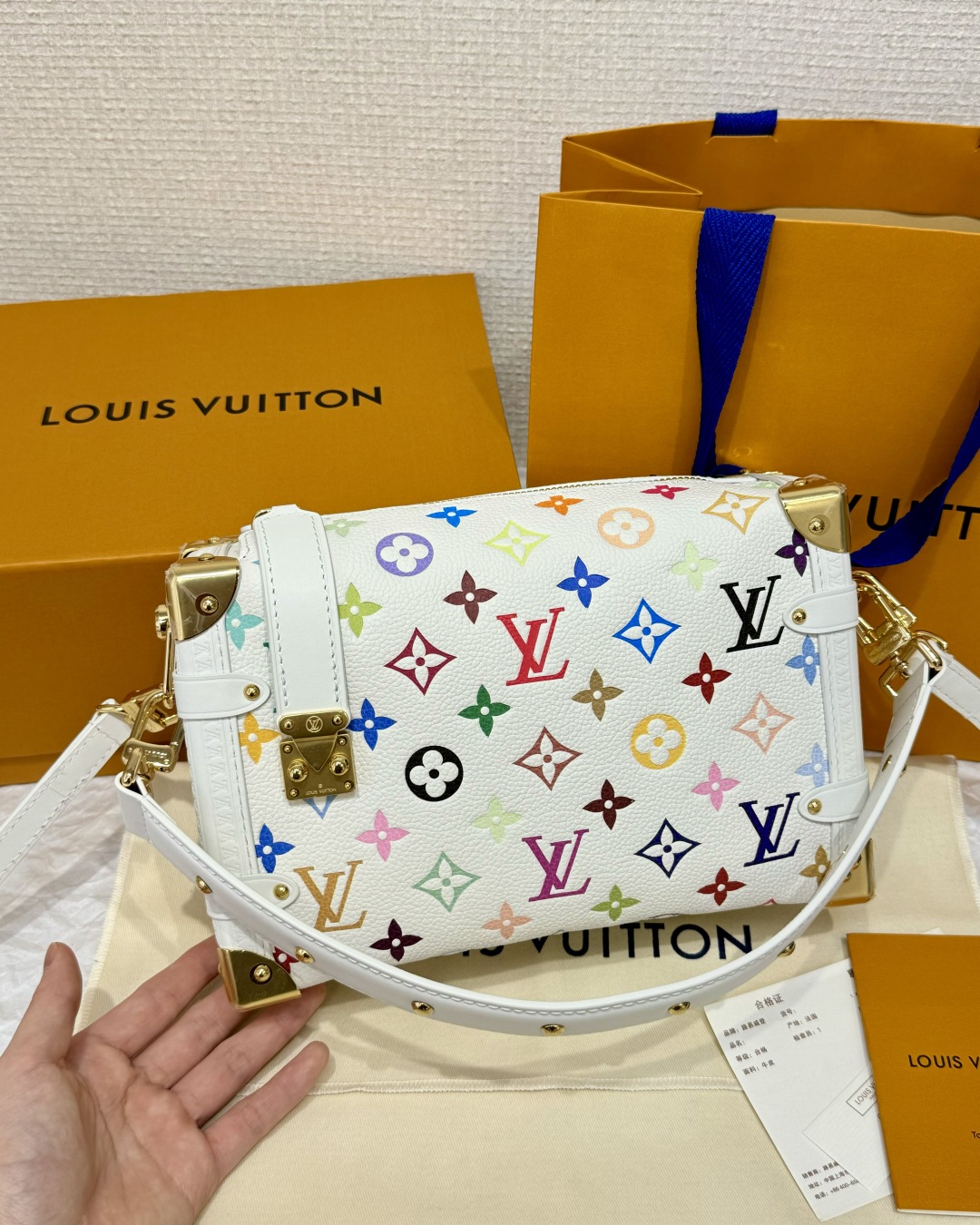 Взрывные модели LOUIS VUITTON x Takashi Murakami. Мураками совместные модели SIDE TRUNK, съемный регулируемый плечевой ремень Liu Yifei, белая трехцветная воловья кожа, кроссбоди сумка средняя. Длина 23,5 см, ширина 8,5 см, высота 16 см.