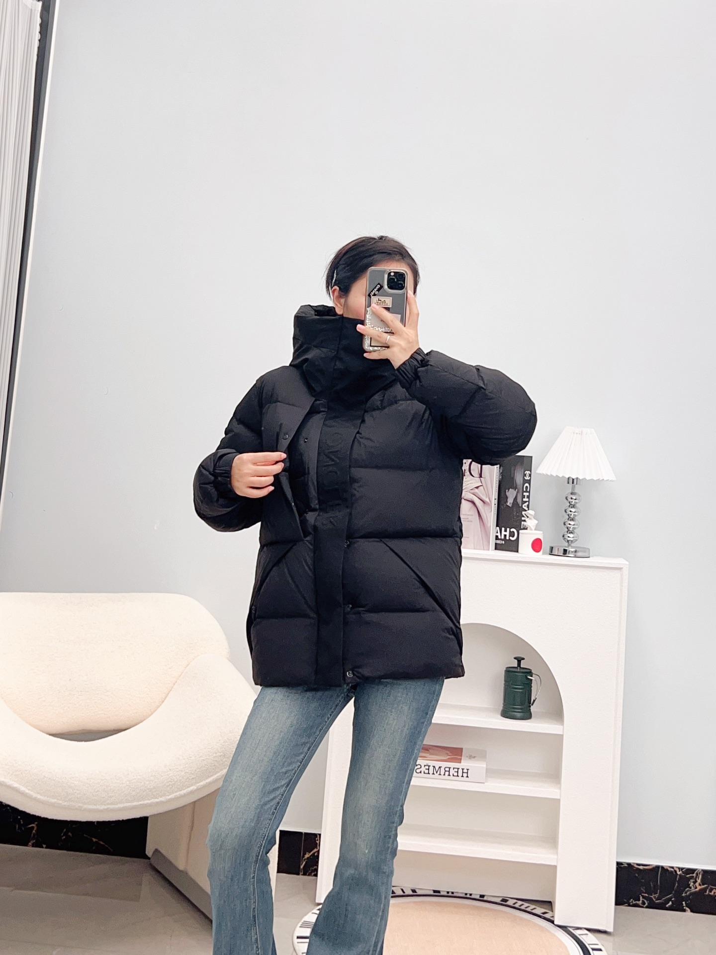 Капюшон и передняя планка выполнены из 2,5 слоев ткани. Тисненая надпись логотипа, потайная пуговица и застежка-молния, внешние карманы на потайной кнопке, нагрудные карманы на молнии, регулируемый капюшон и подол на эластичной кулиске, матовый черный брендинг. Свободный крой, универсальный стиль для зимы. Можно носить как мужчинам, так и женщинам.
